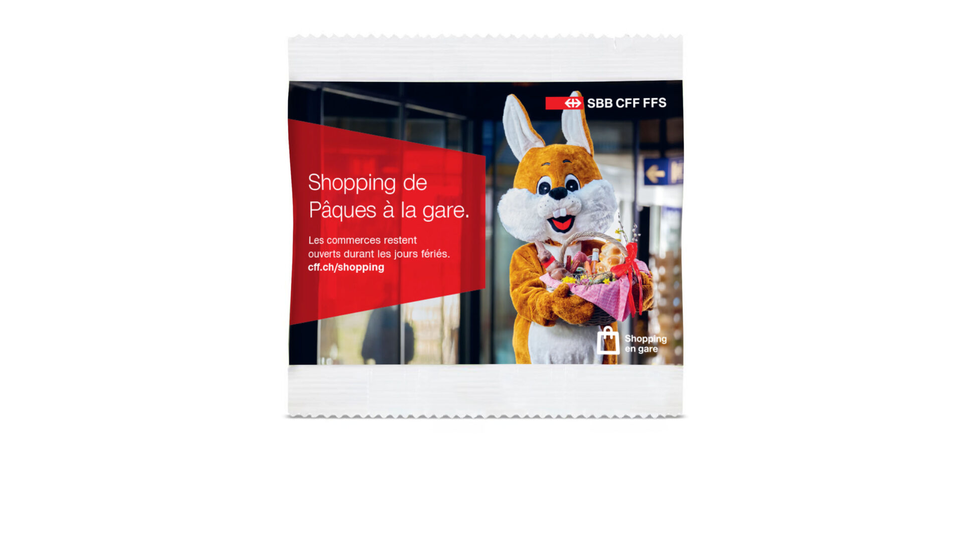 Le chariot de distribution sur place est doté d’un joli visuel de Pâques et d’un texte incitatif aux couleurs CFF. Le message est clair: qu’ils soient modestes ou importants, tous les achats de Pâques peuvent se faire à la gare, de tôt le matin jusqu’à tard le soir, même les jours fériés. Des bannières et des publicités sur les réseaux sociaux viendront compléter cette action au moment de Pâques. Dans les 14 grandes gares, des spots seront par ailleurs diffusés sur des eBoards pour inciter le public à découvrir les commerces sur place.